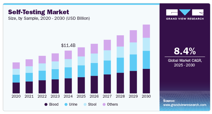 The global self-testing market, valued at $11.4 billion in 2024, is projected to grow at a CAGR of 8.40% from 2025 to 2030, driven by increasing emphasis on personalized healthcare, technological advancements in rapid diagnostics, and rising demand for convenient and rapid diagnostics kits.