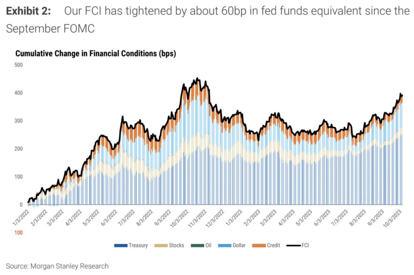 My expectations are that the Fed proceeds with caution leading to bond yield stabilization. Elevated borrowing costs are already being felt in the US economy; the housing market has slowed, credit card delinquency is on the rise and it has cranked up the risk for low-credit-quality corporate bonds. Even if the Fed moves from a higher for longer regime to a high for longer, it will still be a defacto tightening as they continue to reduce the balance sheet.