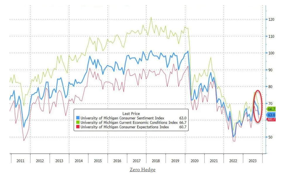 This is also consistent with the results of the consumer sentiment survey which came in on Friday 13th with a record 49% of Americans surveyed saying that high prices are eroding living standards. The University of Michigan consumer sentiment for the US fell to 63 in October 2023 from 68.1 in September, the lowest in five months, and missing market estimates of 67.2, preliminary estimates showed.