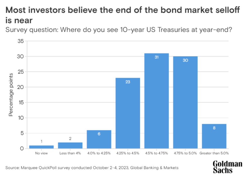 Despite the data, investors are not convinced about another rate hike, even though inflation remains above the Fed's 2% long-term target. Investors are pricing in a 94% chance the Fed will keep rates unchanged at its meeting at the end of this month, and a 70% chance they'll hold tight in December as well, according to the CME FedWatch Tool. Elsewhere, Goldman Sach’s investor survey also mirrors the sentiment that the end of the bond market selloff is near.