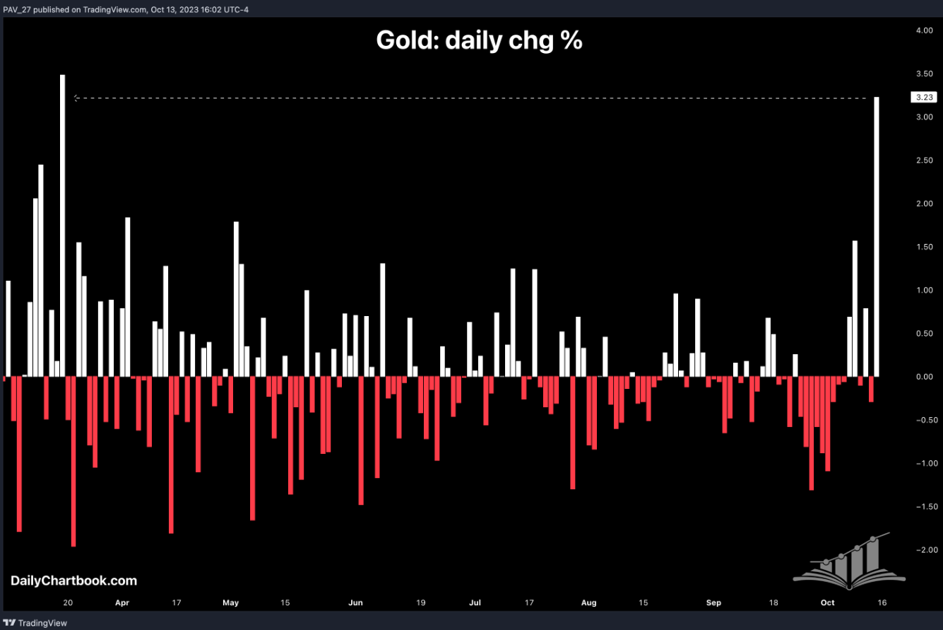 Gold saw its largest daily gain since March and the second largest since March 2020. Is this move all driven by the flight to safety triggered by the Israel-Hamas war or is the inflation hedge story beginning to take hold of Gold?